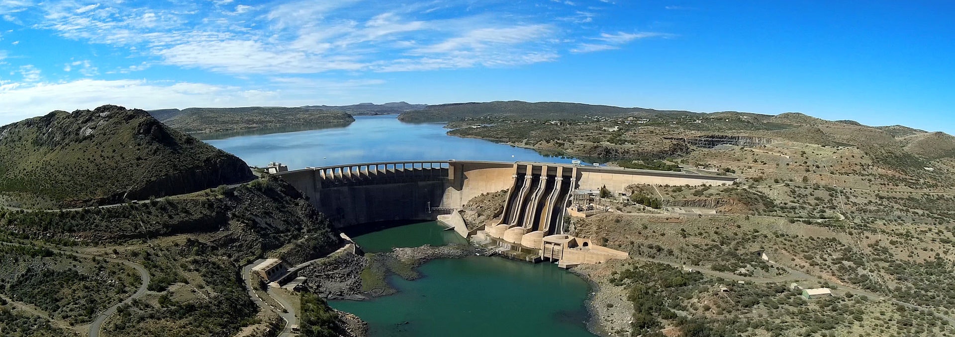 The Vanderkloof Dam (originally the P. K. Le Roux Dam) is South Africa's second largest dam in volume, and has the highest dam wall in the country (108m). It was commissioned in 1977 and is found about 130 kilometres down stream from the popular Gariep Dam. Vanderkloof Dam is fed by the Orange River, South Africa's largest river, and has a capacity of 3,187.557 million cubic metres.It is also fed by several other rivers and has small caves, scenic view points, and areas which are viewable only by boat. There are also numerous activities to be enjoyed on the dam, from angling and boating to water sports.