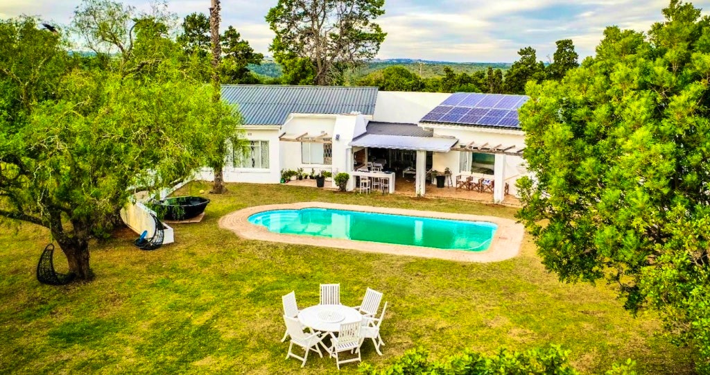 Land’s End is a stunning holiday villa on a farm surrounded by incredible scenery just outside Makhanda. It’s perfect for large groups of family or friends as it can sleep up to 26 guests in six bedrooms. The beautiful living area includes a kitchen with a gas stove and a dining table, as well as a cosy lounge with a fireplace. Outside, you’ll find a covered veranda with a built-in braai, hammocks, a large garden, swing chairs, a swimming pool, and a wood-fired hot tub. The villa is solar-powered and completely off-grid, so load shedding won’t be an issue here.