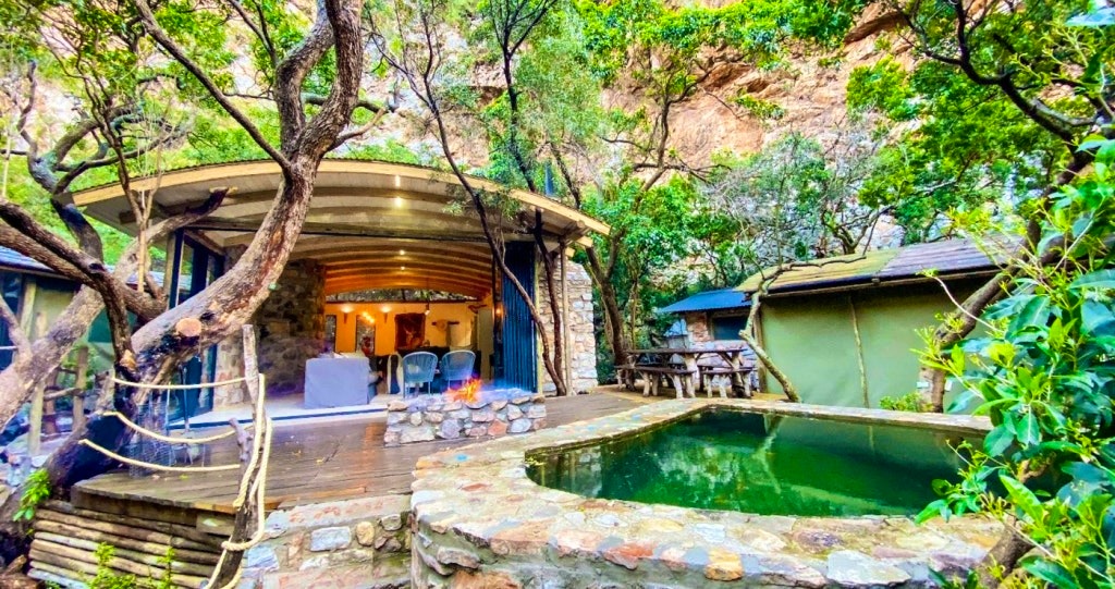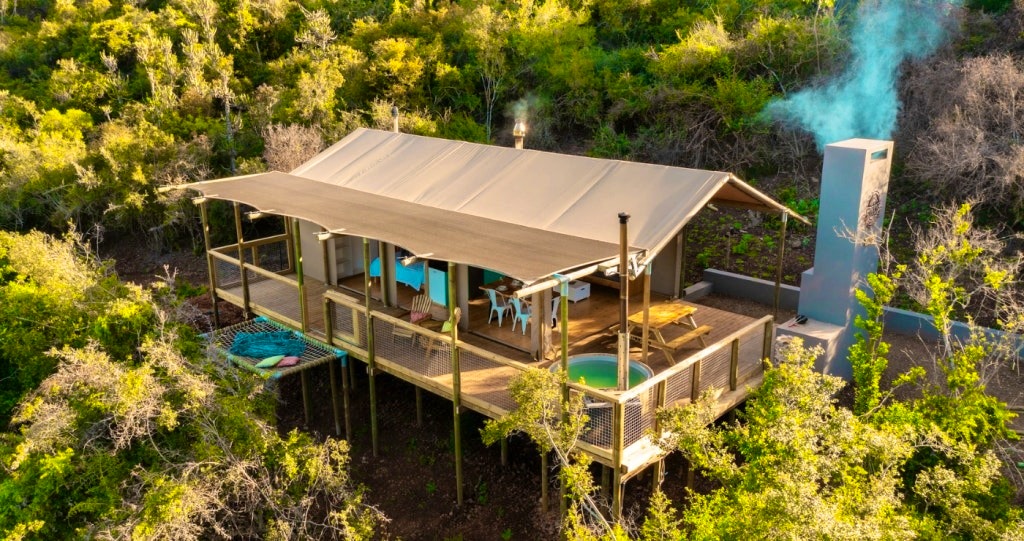 This boutique glamping experience is situated on the beautiful Hayterdale Trails property at the foot of the Zuurberg Mountains in the heart of Addo. There are eight structured tents, each sleeping five guests. Each tent features two bedrooms with ceiling fans and a private bathroom with a shower. The open-plan living area has a fully equipped kitchenette, a dining table, a couch, and a fireplace. This leads to a large deck with braai facilities, a hammock, and a wood-fired hot tub. When you aren’t busy braaiing or relaxing in the hot tub, you can explore scenic mountain bike, trail running, and hiking routes through yellowwood forests and across bushveld hills. Keep an eye out for over 160 bird species, as well as sable and nyala!