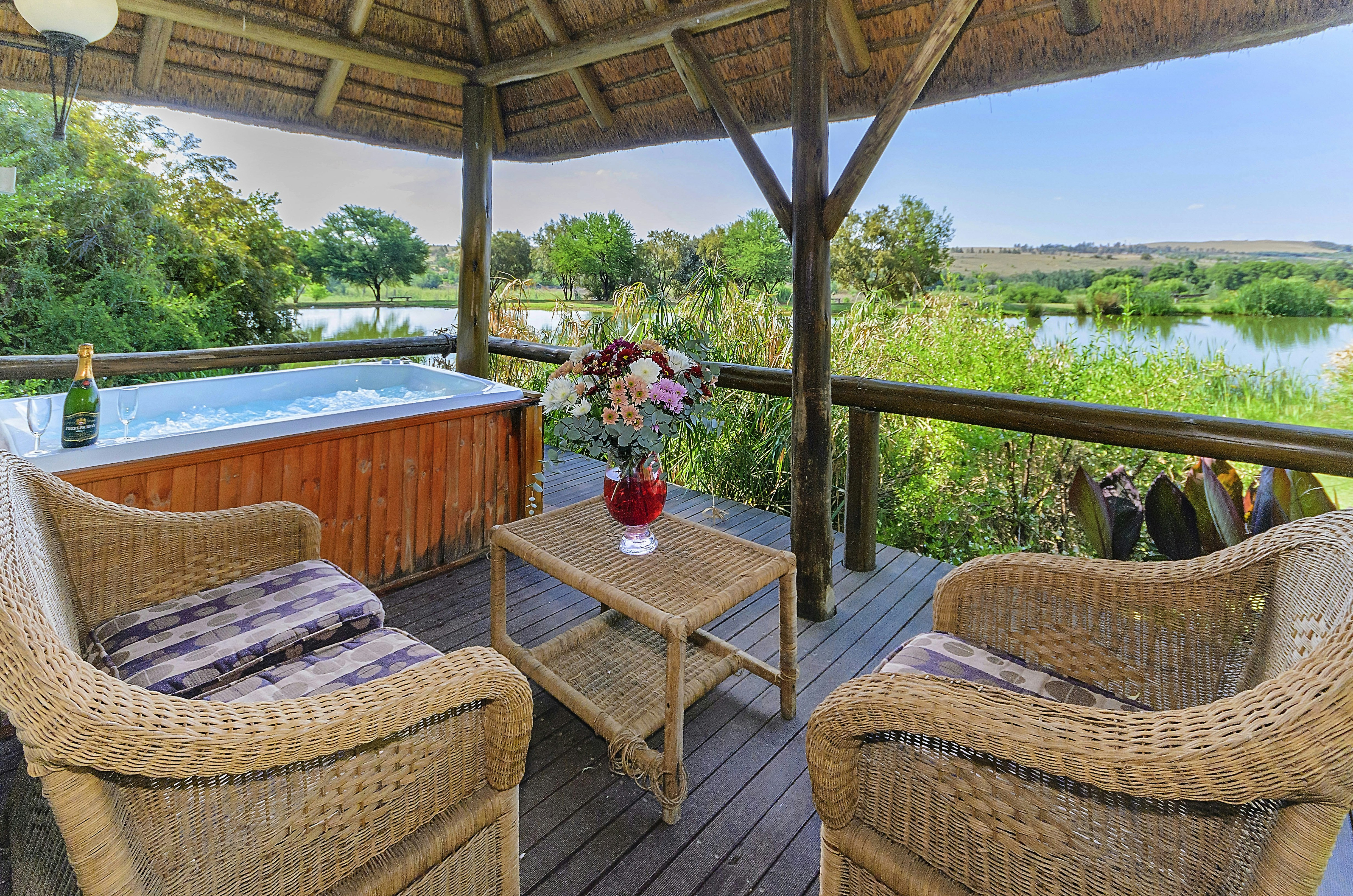 Lookout Safari Lodge, also nestled within the Dinokeng Game Reserve, offers a unique bushveld experience with a choice of self-catering and tented chalets. Each unit has a braai area and a private Jacuzzi. Here you can enjoy a viewing deck that overlooks the bush and the dam. There is also a fire pit next to the swimming pool.